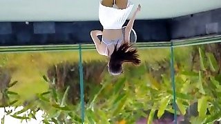 Kawaii sporty Asian lady Machiko Ono gets bald pussy fucked in the pool